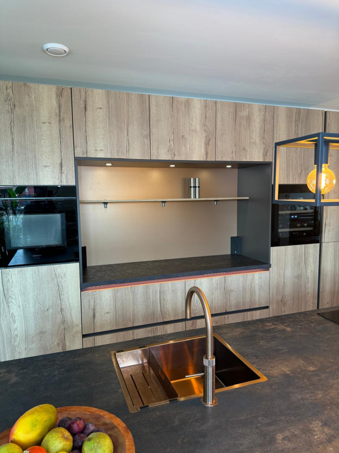 Tijdens de gesprekken nam Paul ruim de tijd om hun wensen door te nemen. “Hij luisterde aandachtig en gaf deskundig advies,” zegt Marc. “Hij dacht echt mee en kwam met slimme oplossingen, zoals extra plankjes en het plaatsen van stopcontacten op precies de juiste plekken.” Het hele ontwerpproces werd zorgvuldig doorlopen en het stel gaf het een welverdiende 9.